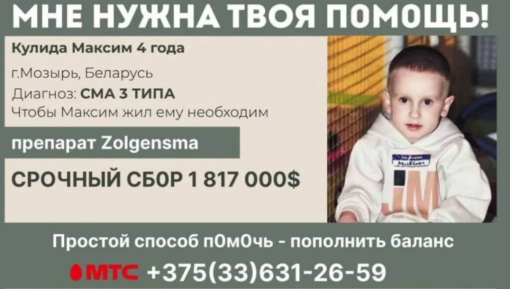 К нам за помощью обратилась Кулида Мария Николаевна. Ее сыну поставлен диагноз спинальная мышечная атрофия 3 типа. Остановить болезнь может препарат ZOLGENCMA, стоимость которого составляет 1 817 000 – долларов США.