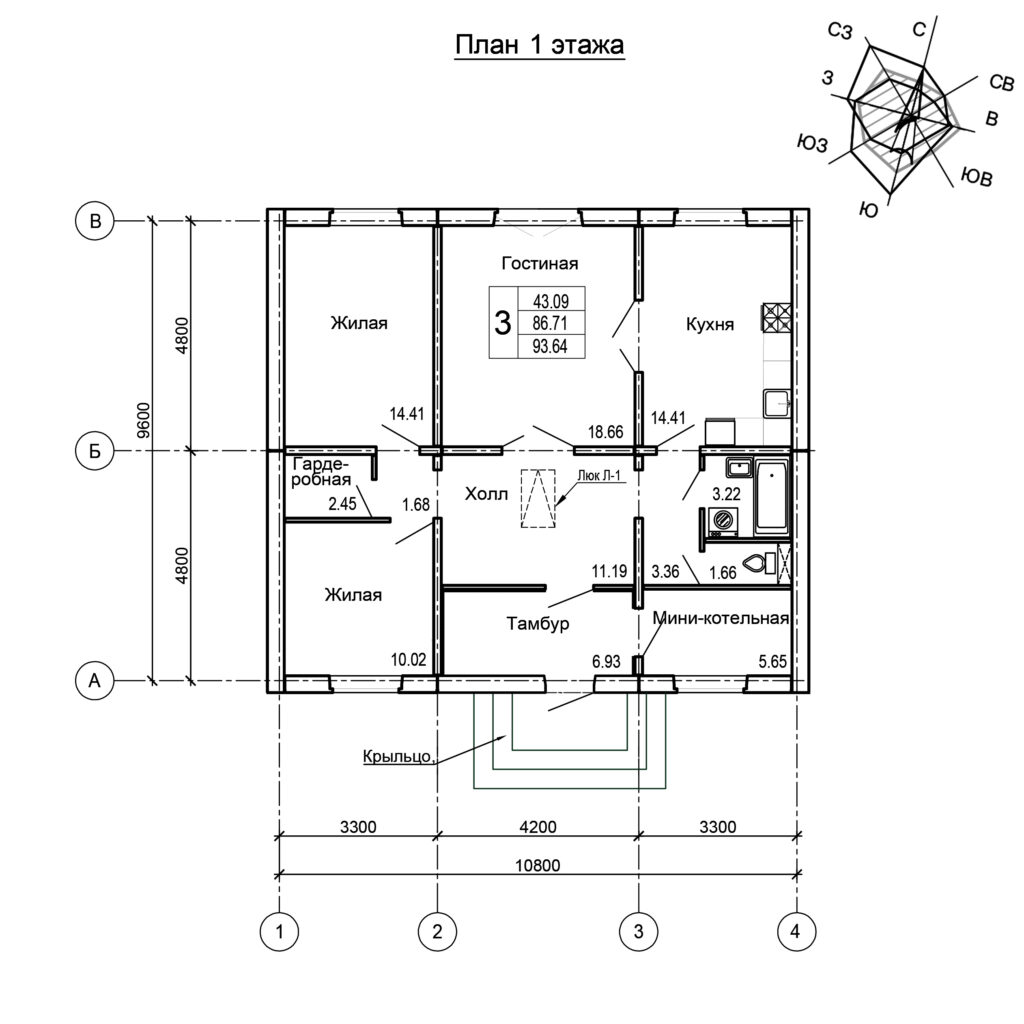 - Общая проектная площадь жилого дома: 93,64 м²;